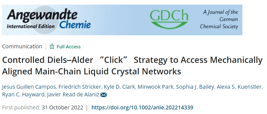 相关研究文章以“Controlled Diels–Alder “Click” Strategy to Access Mechanically Aligned Main-Chain Liquid Crystal Networks”为题发表在Angew. Chem. Int. Ed.上。