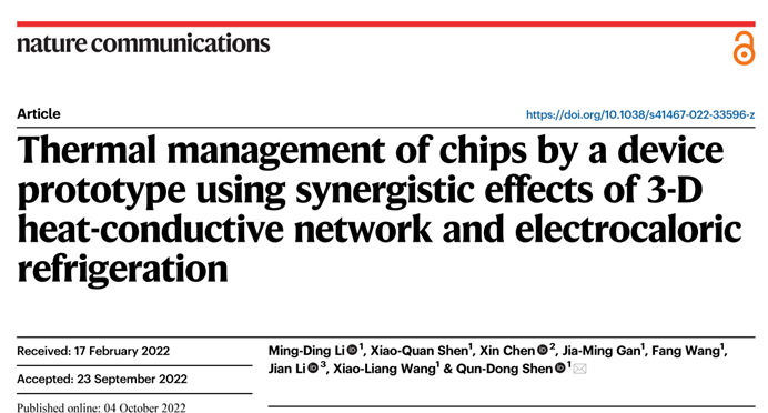 文献链接:Thermal management of chips by a device prototype using synergistic effects of 3-D heat-conductive network and electrocaloric refrigeration,2022,https://doi.org/10.1038/s41467-022-33596-z)