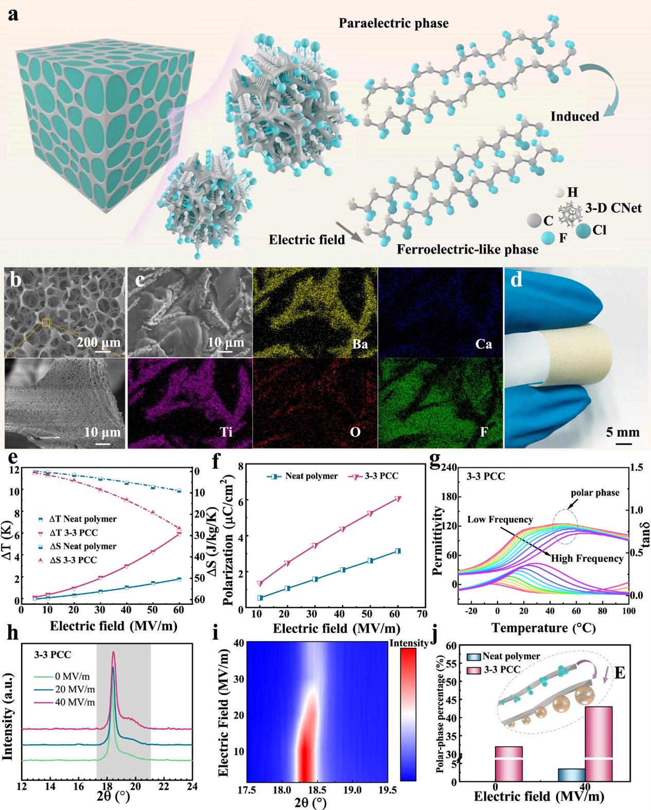 电卡制冷(Electrocaloric refrigeration)作为一种主动的固态制冷技术,具有效率高、环保、易于小型化等特点,依赖于铁电材料在电场变化下的可逆热变。近些年,聚合物铁电体材料因其优异的电热性能、灵活性和易于大规模制造而得到广泛研究。然而,电卡材料固有的低热导率还没有引起研究人员的足够重视,在散热器与热源的高速切换过程中,操作频率增加时往往会出现冷却性能下降的情况。在聚合物基质中构建连续的三维导热网络已被证明是改善被动式热管理材料热传输性能有效简单的方法。