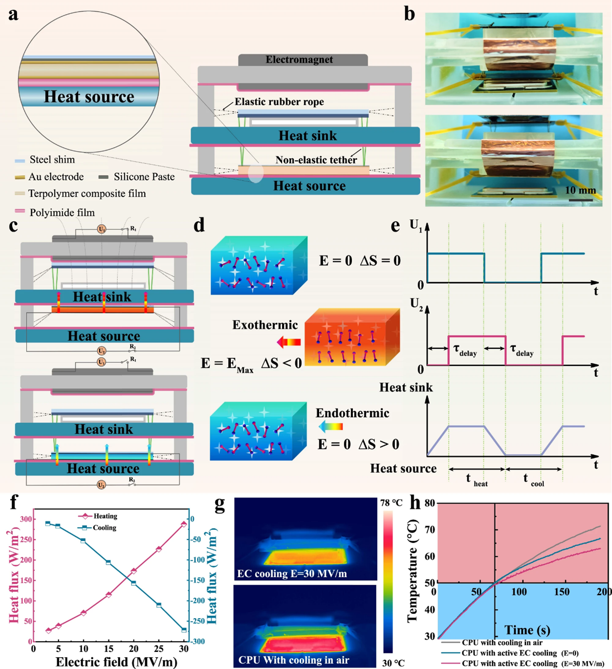 (c)该示意图显示了电磁场如何驱动电热聚合物堆将热量从热源转移到散热器;