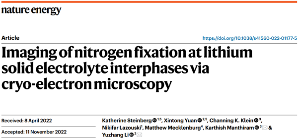 文献链接:Imaging of nitrogen fixation at lithium solid electrolyte interphases via cryo-electron microscopy (Nat. Energy, 2022, DOI: 10.1038/s41560-022-01177-5)