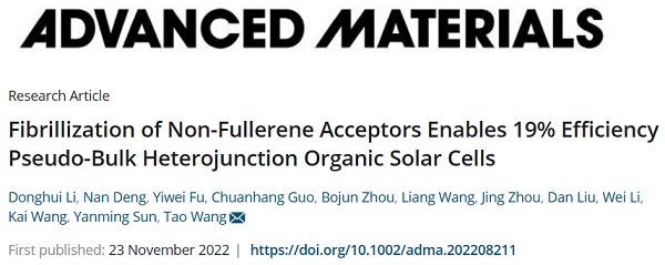 文献链接:Fibrillization of Non-Fullerene Acceptors Enables 19% Efficiency Pseudo-Bulk Heterojunction Organic Solar Cells (Adv. Mater., 2022, 2208211)