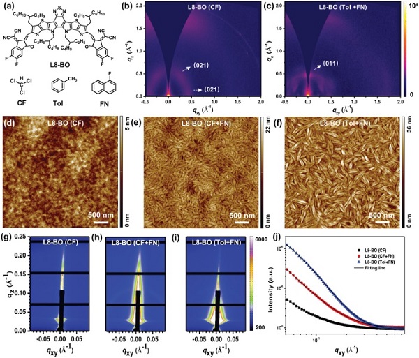 (g-j)由不同溶剂构筑的L8-BO膜的2D GISAXS图案,以及沿qxy轴的相应的1D GISAXS图案。