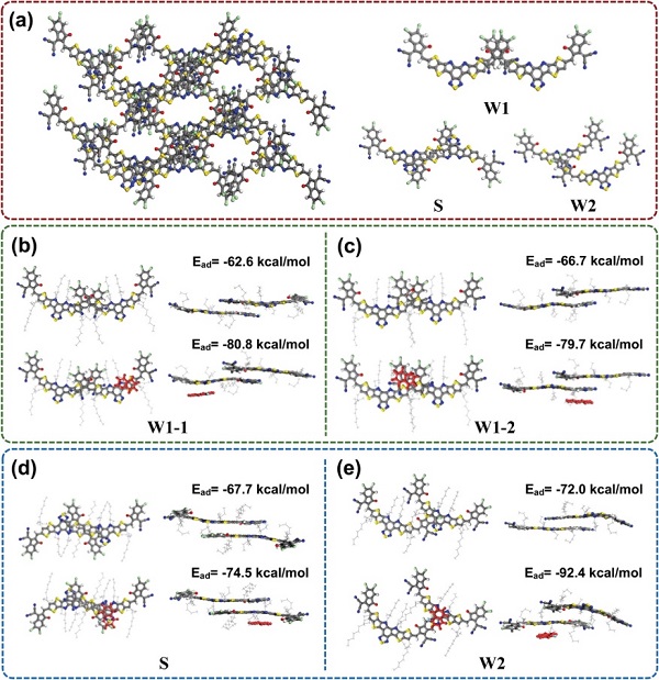 (b-c)在FN存在和不存在的情况下,各种L8-BO二聚体的构型和吸收能:(b)W1-1(在双噻吩单元上吸收的FN)、(c)W1-2(在端基吸收的FN)、(d)S、(e)W2。