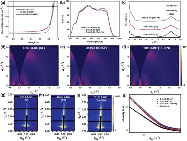 (g-j)D18:L8-BO(CF)BHJ、D18/L8-BO(CF)和D18/L8-BO(Tol+FN)P-BHJ膜的2D GISAXS图案,以及沿qxy轴的相应1D GISAXS图案。