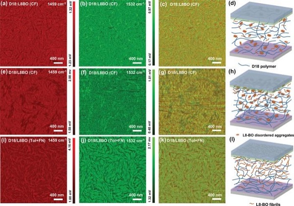 (a-c, e-g, i-k)D18:L8-BO(CF)BHJ、D18/L8-BO(CF)和D18/L8-BO(Tol + FN)P-BHJ薄膜在1459 cm-1观察的D18、1532 cm-1观察的L8-BO以及重叠图像的PiFM图像。