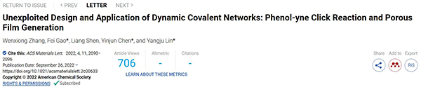 相关研究成果以“Unexploited Design and Application of Dynamic Covalent Networks: Phenol-yne Click Reaction and Porous Film Generation”为题发表在ACS Materials Lett.上。
