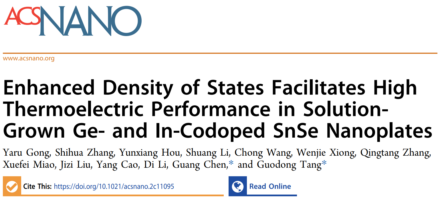 相关研究成果以题为“Enhanced Density of States Facilitates High Thermoelectric Performance in Solution-Grown Ge and In codoped SnSe Nanoplates”发表在知名期刊ACS Nano上。