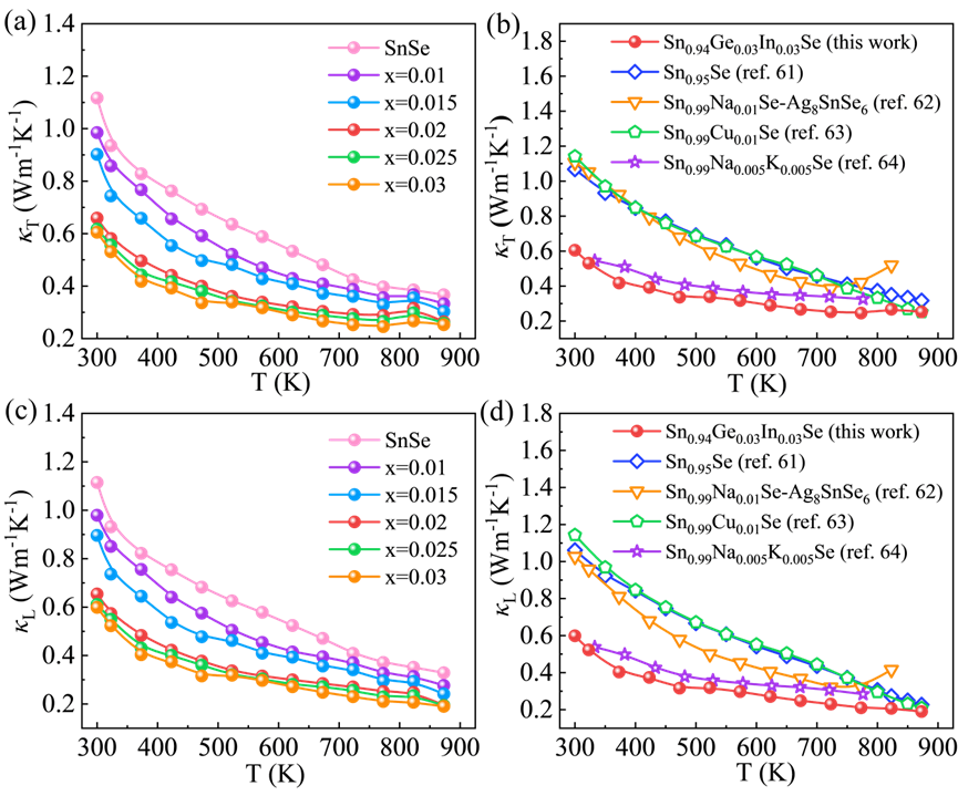 图2 Sn1-2xGexInxSe纳米片的(a)总热导率(kT),(b)kT与相关报道对比,(c)晶格热导率(kL),(d)kL与相关报道对比。