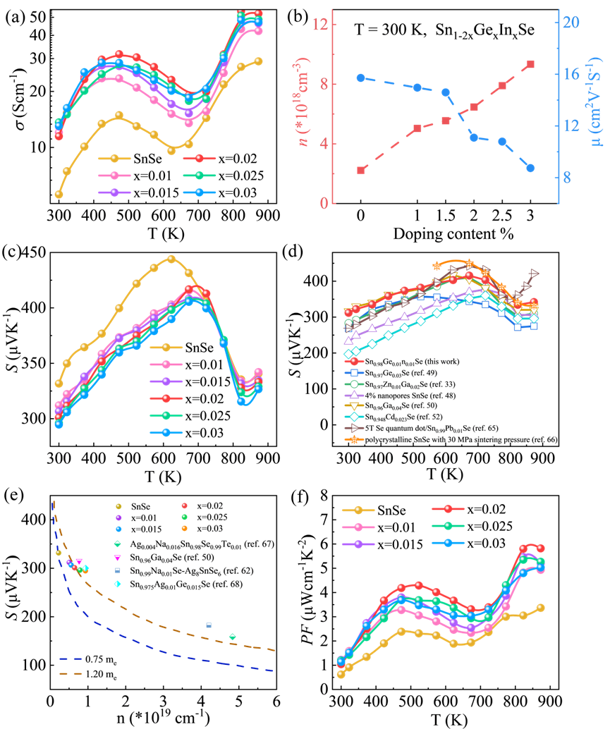 图4 Sn1-2xGexInxSe纳米片的(a)电导率,(b)载流子浓度和迁移率,(c)赛贝克系数,(d)赛贝克系数与相关报道的比较,(e)赛贝克系数与载流子浓度依赖性,(f)功率因子