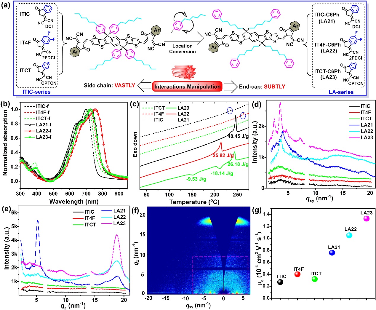图1(a)相关受体的化学结构和(b)薄膜吸收光谱。(c)加热过程的DSC图。(d和e) GIWAXS研究的IP方向和OOP方向的线切割剖面。(f) LA23的二维GIWAXS图。(g)受体的电子迁移率。© 2022 Wiley