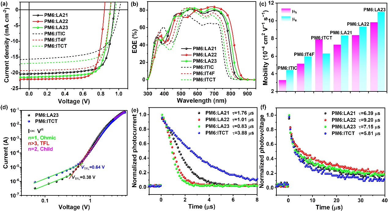 图3 (a)二元太阳能电池的最佳J-V图。(b)相应的EQE曲线。(c)基于SCLC研究的二元共混物迁移率。(d) PM6:ITCT和PM6:LA23器件的I−V特性响应。(e, f) TPV和TPC衰变动力学。© 2022 Wiley