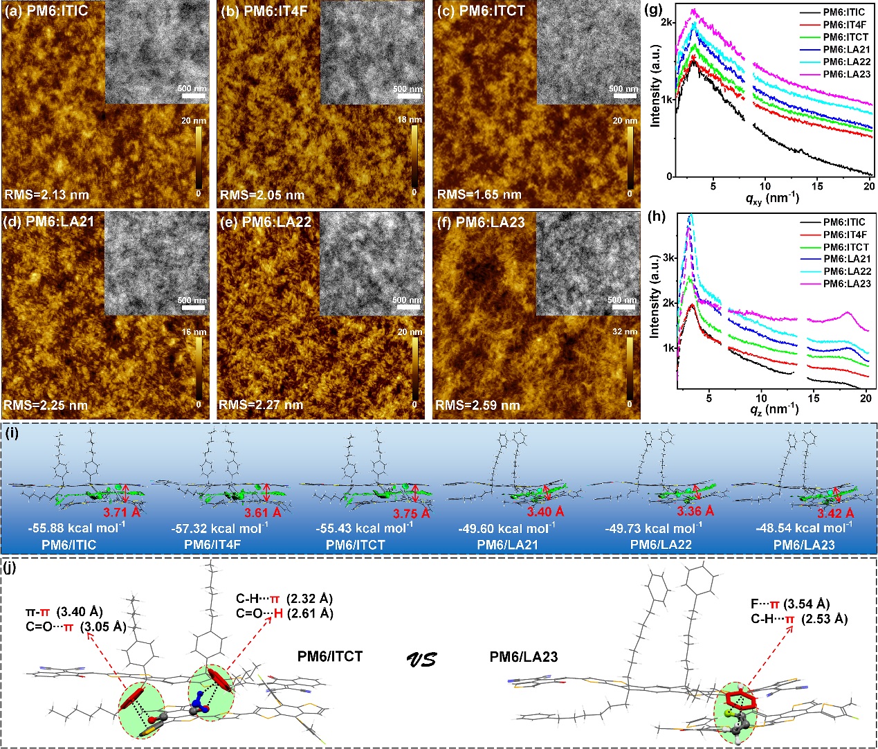 图4 (a-f) AFM和TEM图。(g, h) GIWAXS研究的IP方向和OOP方向的线切割剖面。(i)优化的D/A构象、IGMH映射、结合能和叠加距离。(j)侧组相关交互分析。© 2022 Wiley