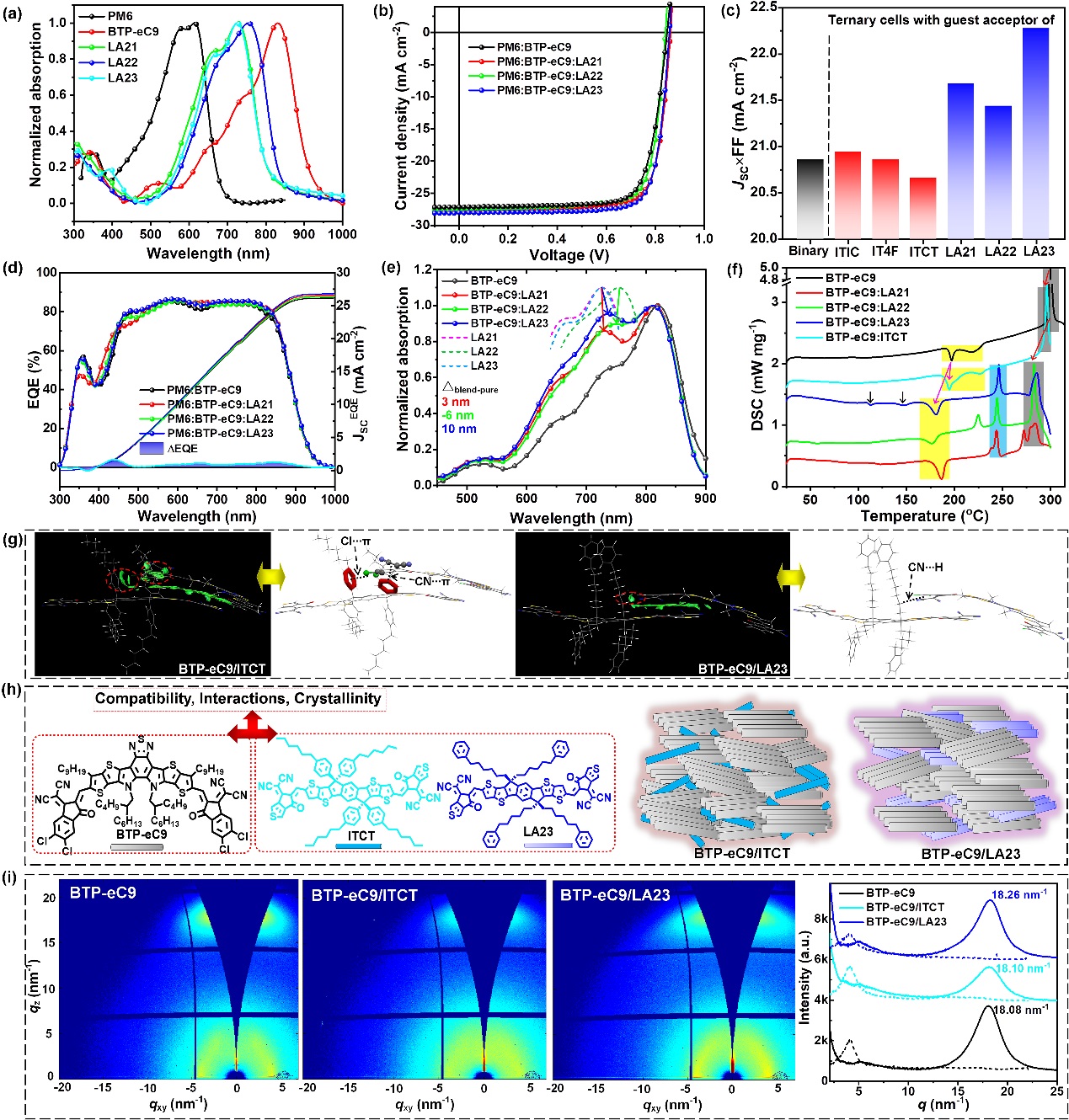 图5 (a) PM6、BTP-eC9和客体受体的薄膜吸收光谱。(b)二元和三元器件的最佳J-V图。(c) JSC和FF的产品。(d) EQE剖面。(e)单受体和双受体的膜吸收(BTP-eC9:guest=1.2:0.2, w/w)。(f) BTP-eC9和双受体的DSC图。(g) BTP-eC9:ITCT和BTP-eC9:LA23对IGMH图谱和相互作用位点分析。(h)双受体混合相的化学结构和分子聚集。(i) BTP-eC9、BTP-eC9:ITCT和BTP-eC9:LA23薄膜的二维GIWAXS和线切剖面。© 2022 Wiley