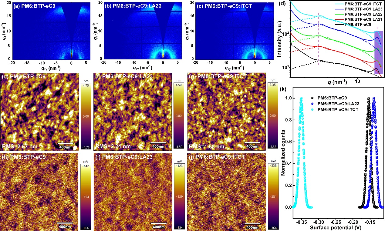 图6 (a-d) PM6:BTP-eC9、PM6:BTP-eC9:LA23和PM6:BTP-eC9:ITCT共混物的GIWAXS图谱和线切剖面。(e-g) AFM图像和(h-j)对应的接触电位。(k)分布在表面上的表面势的统计。© 2022 Wiley