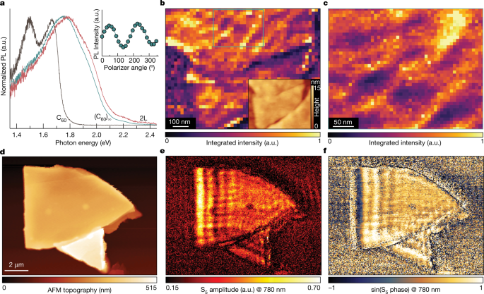图4 光致发光和扫描近场光学显微镜;a,C60、石墨烯和双分子层石墨烯(2L)的PL谱。插图: 石墨-富勒烯发光强度的偏振依赖性;b, 12纳米厚石墨烯薄片的纳米PL图像;插图:片状的AFM形貌。c,b中蓝框区域的高分辨率图像,显示了PL强度在大约50纳米长度尺度上的变化;d,利用原子力显微镜获得的315nm厚石墨-富勒烯的形貌图像;e,使用780 nm的入射激光,在d所示的薄片尖端收集五次谐波近场振幅;f,归一化到SiO2衬底的相关近场相位。© 2022 Springer Nature