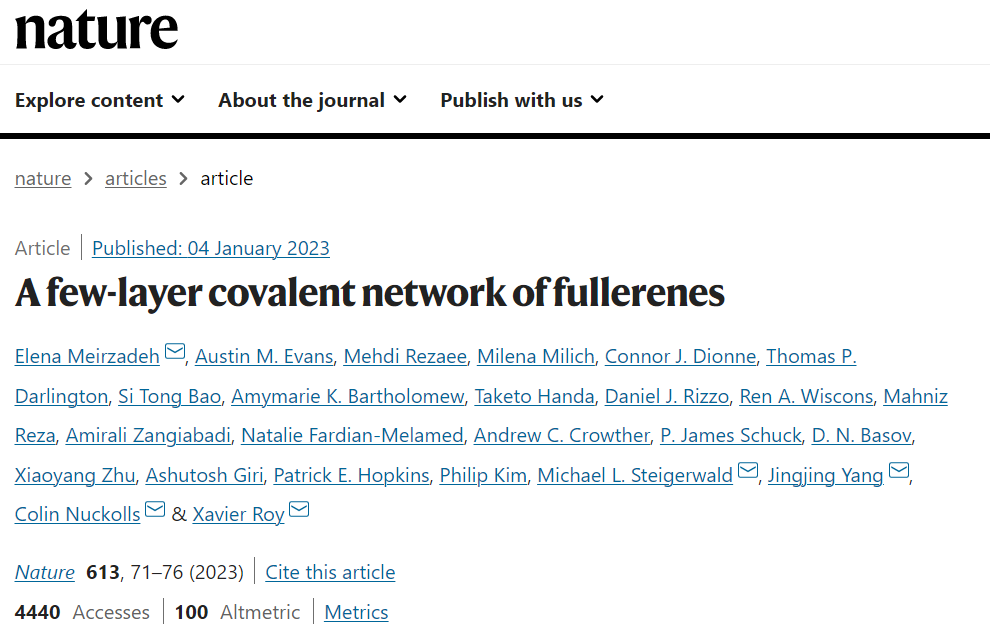 近日,来自美国哥伦比亚大学的Michael L. Steigerwald、Jingjing Yang、Colin Nuckolls、Elena Meirzadeh、Xavier Roy等研究人员报道了一种新型聚合物石墨-富勒烯(Graphullerene),其本质是C60的二维聚合物,由富勒烯次级结构以六方晶格形式相互共价连接构成。这种结构的形成打破了分子和碳材料不能结合构建的鸿沟。此外,作者还构筑了电荷中性,纯碳基的宏观晶体材料,为创造异质结构和光电子器件提供了清晰的思路。相关研究以“A few-layer covalent network of fullerenes”为题发表在国际顶刊Nature上。