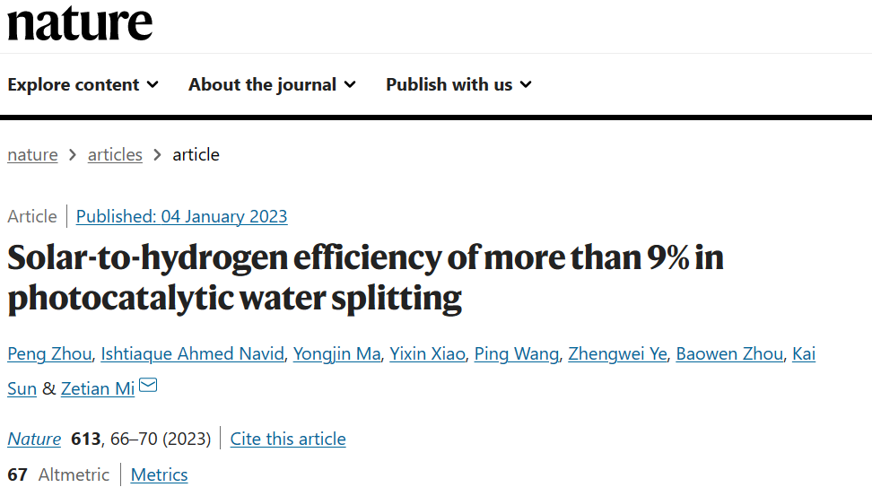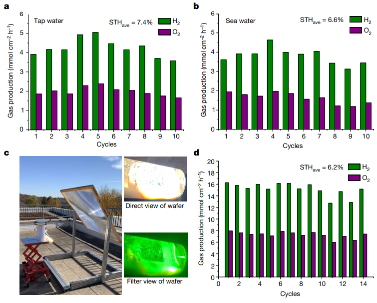 该研究在最佳反应温度(约70摄氏度)条件下,通过使用强太阳光、纯水、氮化铟镓光催化剂,实现了9.2%的高STH效率。此外,这种具有温度依赖性的方法可以从自来水和海水中实现约7%的STH效率,在天然太阳能容量为257瓦的大规模光催化水分解系统中实现6.2%的STH效率。该研究提供了一种利用自然太阳光和水高效生产氢燃料的实用方法,克服了太阳能制氢的效率瓶颈。