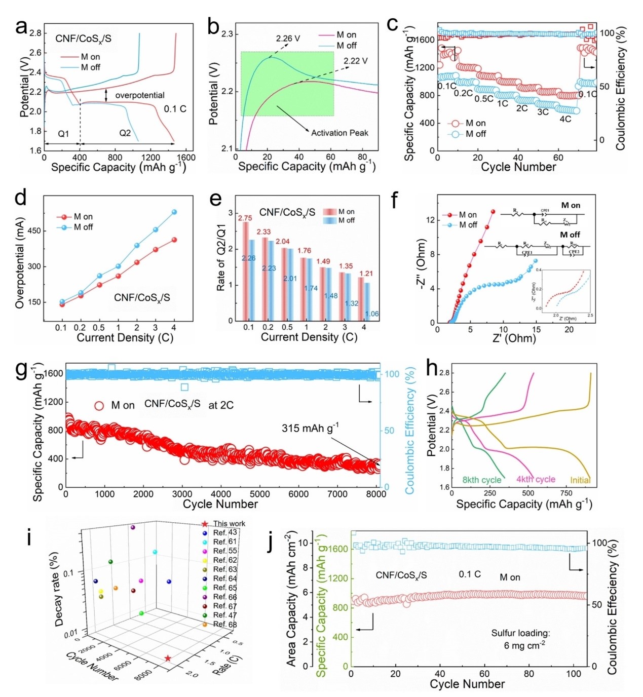 图5a显示了CNF/CoSx/S基电池在0.1 C下有无外部磁场的情况下的充电/放电曲线。在磁场存在的情况下,基于CNF/CoSx/S的电池显示出更大的容量和明显较低的过电位。图5b中显示了第一次充电过程的活化能。结果发现在有无外部磁场的情况下得到的曲线之间有明显的差异。在磁场存在的情况下,CNF/CoSx/S电极呈现出低得多的活化能,表明催化活性更好,氧化还原动力学更快。图5c显示了电池在0.1到4 C范围内的倍率性能。在磁场存在的情况下,CNF/CoSx/S电极展示出更优异的电化学性能。如图5f所示,在磁场存在的情况下,CNF/CoSx/S半电池的EIS得到的电荷转移电阻和离子扩散电阻比没有磁场时要小,与对称电池得到的结果一致,这进一步证实了促进Li2S2/Li2S在Li-S电催化反应中有序沉积的自旋效应。在稳定性方面,在磁场的存在下,即使在2 C的高电流密度下,CNF/CoSx/S在8150次循环后下降到315 mAh g-1,单圈循环容量损失仅为0.0084%的(图5g和h)。总的来说,在磁场存在的情况下,电池的性能大大超过了以前的研究报告,不仅增加了电池比容量,在稳定性方面也展示出了卓越的性能,减少了Li-S转换的势垒(图5i)。