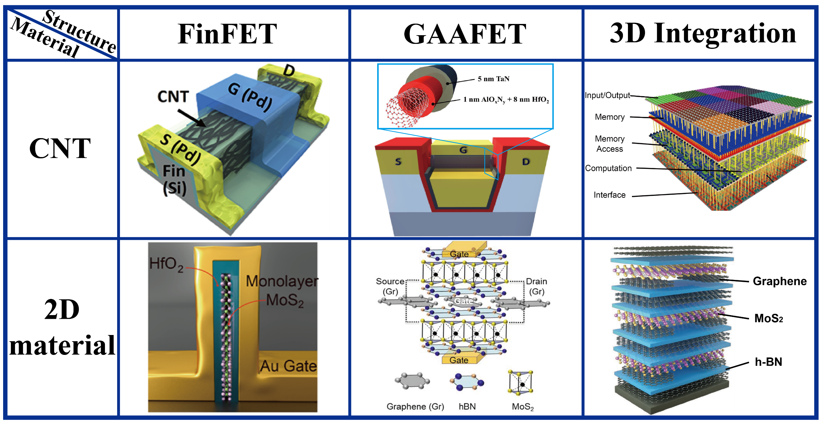 自20世纪60年代以来,金属-氧化物-半导体场效应晶体管(MOSFET)的特征尺寸按照摩尔定律的指引已经缩小到纳米尺度,通过实现更小、更快、更低功耗的器件,将进一步有效增加芯片上晶体管的集成密度。在器件性能迭代发展过程中,为应对短沟道效应等方面的挑战,一方面人们开发了鳍式场效应晶体管(FinFET)、环栅场效应晶体管(GAAFET)和三维集成等三维结构器件和系统技术,另一方面也提出使用碳纳米管(CNT)、石墨烯和二维过渡金属硫化物(TMDC)等低维材料作为沟道发展低维电子器件(图1)。如果能够充分结合上述两种发展策略,基于低维材料的三维结构晶体管将有望实现高效的栅极控制能力和更高的器件密度,推动芯片技术进一步沿着摩尔定律发展。