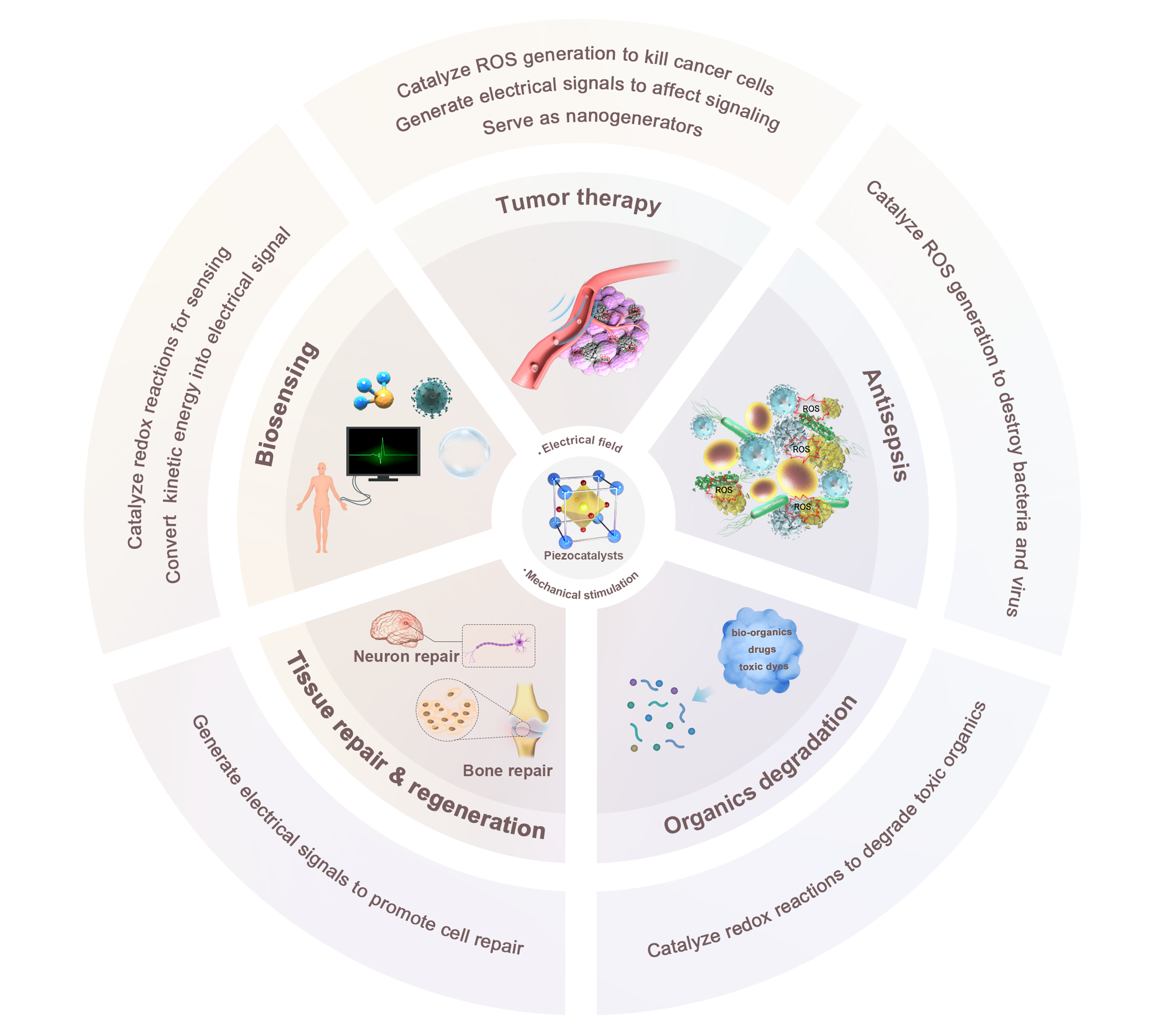 广泛应用于机械、电子、能源、航空航天、环保等领域的压电材料,近年来在医疗领域显示出了巨大的发展潜力。这些压电材料的生物医学应用,称为“压电医学(Piezomedicine)”。压电材料具有独特的压电性能,可通过所受应力诱导电荷载流子的分离,高效地催化化学反应,还可产生电信号影响生命活动,甚至可以利用周围环境中相对微弱和分散的能量资源,如人体运动和心脏跳动,给自供能的生物医学应用带来可能,并可以嵌入智能化设备当中,因此被应用于疾病治疗、有毒物质降解和生物传感等医疗领域,呈现出蓬勃的前景。目前,尽管相关压电材料的研究发展迅速,但其在医疗领域尚无系统总结。