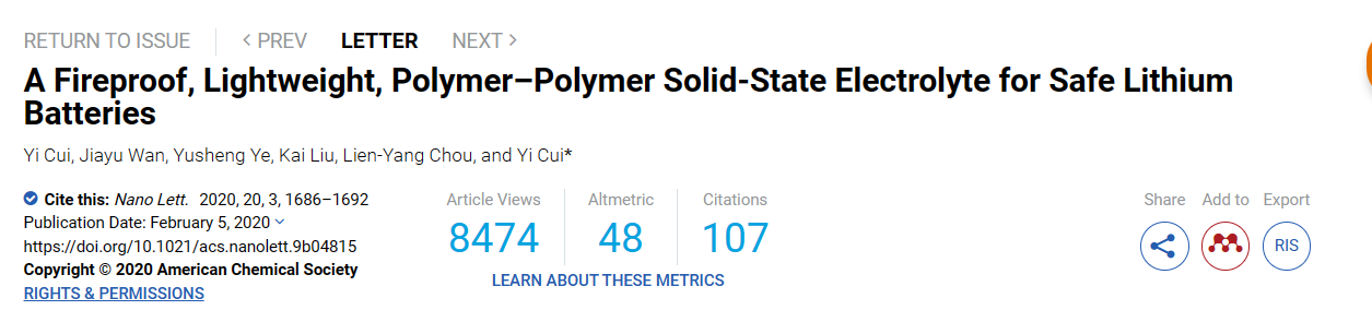 相关研究工作以“A Fireproof, Lightweight, Polymer−Polymer Solid-State Electrolyte for Safe Lithium Batteries”为题发表在国际顶刊Nano Letters上。