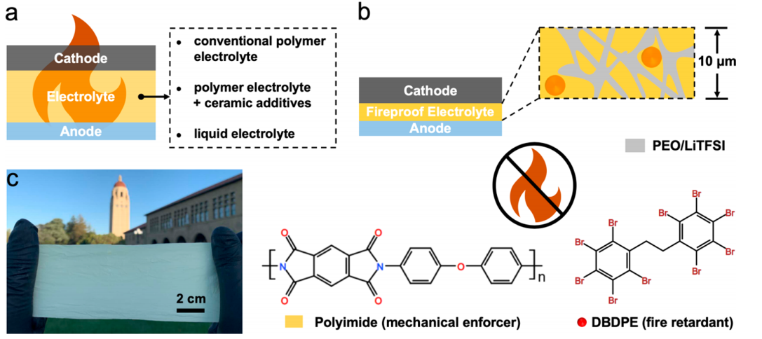 斯坦福大学崔屹教授课题组设计了一种防火、超轻的复合聚合物固态电解质,电解质的电池不仅使得金属锂电池具有优异的电化学性能,也使得电池具有极高的安全性。复合SSEs是由多孔聚酰亚胺主体框架与锂离子SPE填料制成。采用轻质阻燃材料十溴二苯乙烷(DBDPE)制成微米厚的多孔聚酰亚胺(PI)薄膜,不仅具有较强的力学性能,防止锂枝晶穿透,还具有 SSEs的防火性能。由聚环氧乙烷/双三氟甲烷磺酰基锂(PEO/LiTFSI)组成SPE填料,具有较高的离子电导率。复合电解质的超薄和聚合物性质使全电池具有很大的灵活性,低电解质电阻和潜在的高能量密度。