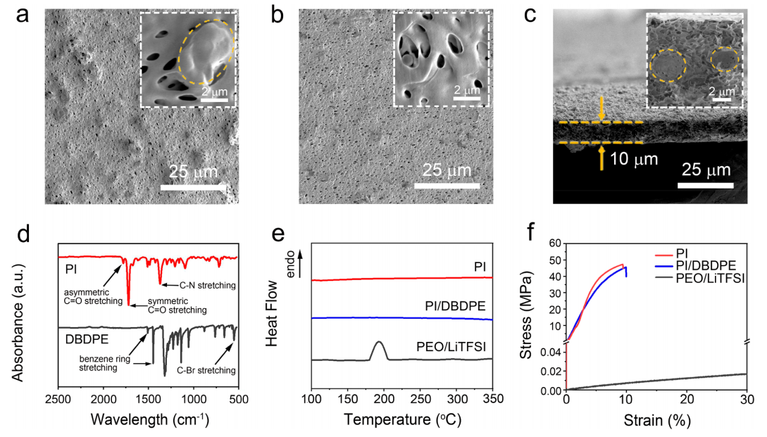 图2 (a) 流延成型过程中PI/DBDPE薄膜接触空气的表面形貌的SEM图像(插图为面板a的典型放大SEM图像)。(b) PI/DBDPE薄膜在流延成型过程中对玻璃表面形貌的SEM图像(插图为面板b的典型放大SEM图像)。(c) 典型PI/DBDPE薄膜的截面SEM显示PI/DBDPE薄膜的厚度(插图为面板c的典型放大SEM图像)。橙色虚线圈代表DBDPE颗粒。(d) PI薄膜和DBDPE颗粒的FTIR光谱。(e)多孔的DSC光谱。(f)多孔PI/DBDPE薄膜、多孔PI薄膜和PEO/LiTFSI薄膜的应力-应变曲线。© 2020 American Chemical Society