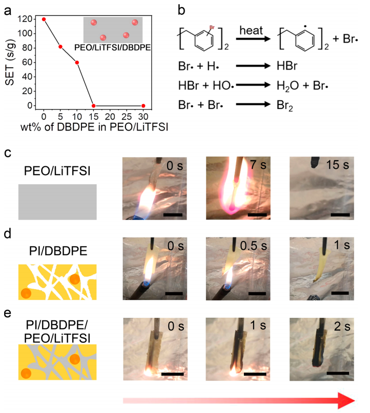 图3 (a)不同DBDPE权重百分比的PEO/LiTFSI的SET。(b)的阻燃机理DBDPE。(c)PEO/LiTFSI,(d) PI/DBDPE和(e) PI/DBDPE/PEO/LiTFSI的火焰测试。比例尺,1厘米。© 2020 American Chemical Society
