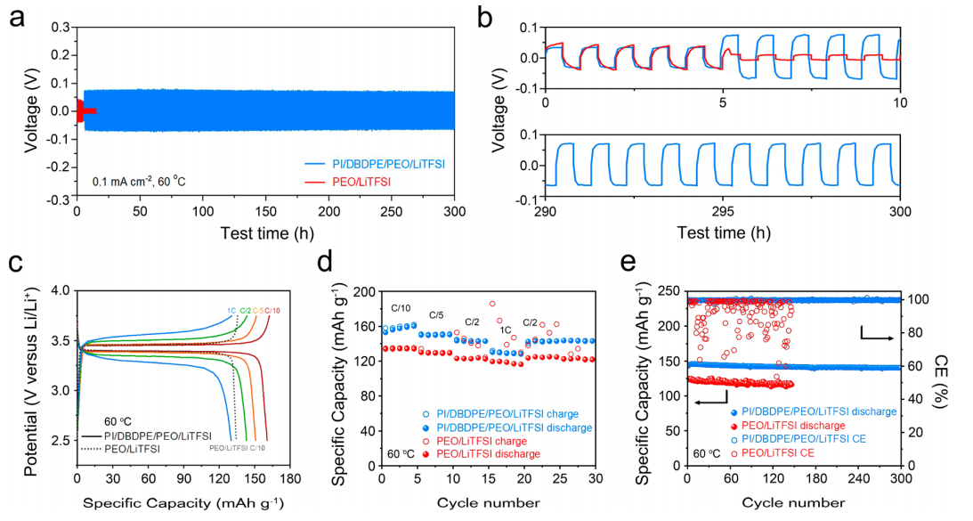 图4 (a)对称Li−Li电池与PI/DBDPE/PEO/LiTFSI SSE和PEO/LiTFSI薄膜电解质在60℃下的长期循环。(b) PI/DBDPE/PEO/LiTFSI SSE和PEO/LiTFSI薄膜电解质的对称Li−Li电池在第0 ~ 10个周期和第290 ~ 300个周期的电压分布。(c)在60℃循环时,Li/PI/DBDPE/PEO/LiTFSI/LFP电池在不同充电速率下的电压分布。黑色虚线表示C/10,60°C 温度下,Li/PEO/LiTFSI/LFP电池的循环。(d) Li/PEO/LiTFSI/LFP电池和Li/PI/DBDPE/PEO/LiTFSI/LFP电池在60°C循环的速率性能。(e) Li/PEO/LiTFSI/LFP和Li/PI/DBDPE/PEO/LiTFSI/LFP电池在C/2, 60°C的循环性能。© 2020 American Chemical Society