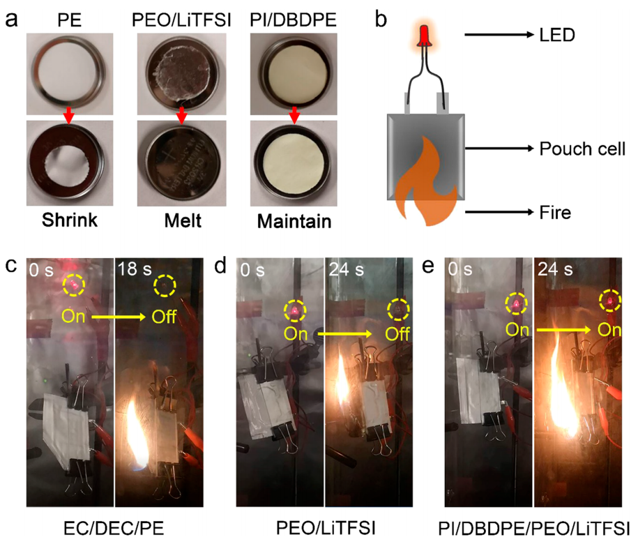 图5 (a) PE分离器、PEO/LiTFSI和PI/DBDPE薄膜暴露于热冲击(150°C, 0.5 h)前后的照片。(b)以LFP为阴极、LTO为阳极的软包电池燃烧环境下试验示意图。(c, d, e)分别以(c) EC/DEC/PE、(d) PEO/LiTFSI、(e) PI/DBDPE/PEO/LiTFSI为电解质的电池在火焰燃烧下试验。© 2020 American Chemical Society
