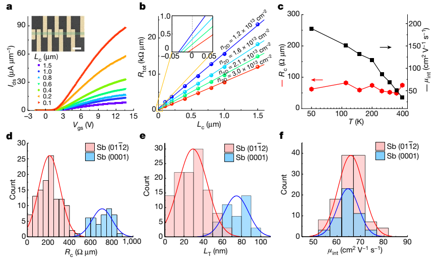 (a) Lc范围为0.1 μm ~ 1.5 μm, Vds = 0.1 V的典型TLM结构的传输曲线。(b) 采用TLM法从a中器件中提取的Rc。(c) Rc(红色方块)和固有迁移率(黑色菱形)与温度的关系。(d – f) Sb(0112)和Sb(0001)触点的Rc (d)、LT (e)和μint (f)分布。