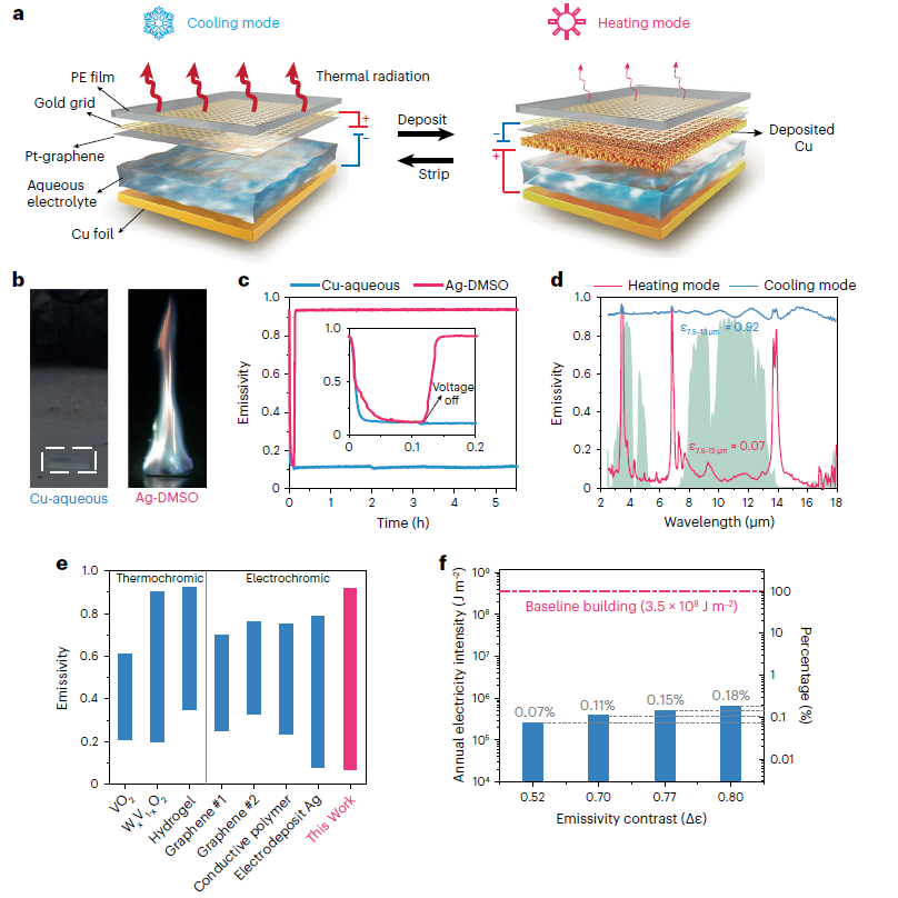 图1:水性电解质电致变色中红外调制系统的概念和优势。 (a) 电致变色系统的示意图演示。该设备可以在加热模式(铜沉积)和冷却模式(铜剥离)之间进行调整。 (b) Cu-水和 Ag-DMSO 电解质的可燃性测试。 (c) 加热模式(金属涂层)的不挥发性测试。 λ = 10 微米。 (d) 加热和冷却模式的 FTIR 光谱。绿色阴影区域为大气透明窗口。 (e) 可调发射率对比度与不同策略的比较。 (f) 切换到不同发射率的水性装置的年耗电量。红色虚线表示基准建筑物的年用电量。设备切换到不同发射率状态的年用电量占基线建筑物年用电量的百分比标记在条形图上。