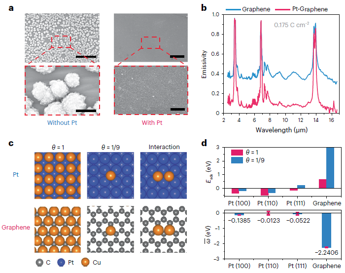 图3:Pt 修饰提高性能的表征和理论解释。 (a) 在有和没有 Pt 修饰的透明电极上沉积的 Cu 形貌的 SEM 图像。低倍率和高倍率图像的比例尺分别为 10 µm 和 1 µm。 (b) Cu 薄膜的 FTIR 光谱沉积在裸露的和 Pt 修饰的石墨烯透明电极上。两个样品都涂有相同的电荷密度,0.175 C cm-2。 (c) DFT 计算的原子图。 (d) 衬底(Pt 或石墨烯)与Cu 原子之间的计算吸附能,以及不同衬底上两个相邻Cu 原子之间的相互作用能。误差线代表平均值⟩±⟩标准差。