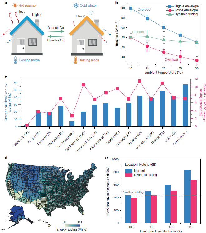 图4:四季节能应用的智能建筑外墙结构。 (a) 具有辐射热管理的智能建筑围护结构方案。通过不断调整发射率,建筑物可以在所有季节有效地保持热舒适性。 (b) 不同围护结构的建筑表面在不同环境温度下的热损失。用于得出统计数据的样本量为 5,误差条表示平均值⟩±⟩标准差。 (c) 采用电致变色装置的建筑物全年运行的暖通空调节能和节能百分比。 (d) 美国所有 15 个气候区的电致变色装置建筑外墙节能图。 (e) 安装/未安装动态发射率建筑外墙的不同隔热建筑的 HVAC 能源消耗。