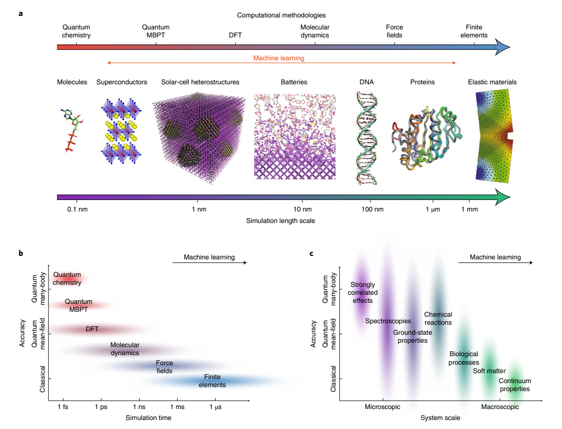 在实践中,必须找到物理动量的近似值来解决不同能量和长度尺度以及不同时间尺度上的问题。在这些不同的尺度上,来自多粒子系统库仑相互作用的突变性质以不同的方式表现出来。从以往研究来看,为不同目标量身定制的计算方法也在不断发展。这些方法通常以多体哈密顿量构成基础,高度相互关联,从而激发了跨学科理论/计算材料研究的活力。到目前为止,研究人员的使用的方法统一为多尺度模型,但该领域已经成熟,可以从机器学习技术入手,识别出复杂系统中和不同尺度之间的新相关性。