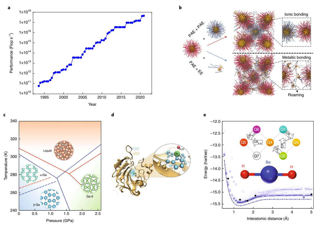 a,世界上最快的超级计算机的历史性能。b,胶体的键合行为。c,分子动力学模拟镓的相图。与实验比较,显示热力学稳定相之间的理论共存线(固体红色)与实验共存线(固体蓝色)。虚线表示β-Ga与液相之间的亚稳平衡相边界。利用机器学习产生的电位达到从头算精度。d,复杂系统的典型量子力学(QM)/分子力学(MM)划分,其中QM用于原子的键合和相互作用,MM与力场一起使用。e,用六个量子位的量子计算机(Q1-Q6)求解BeH2分子。黑点代表量子计算机的直接测量,虚线代表理论精确对角化解,密度图代表六量子比特量子计算机的数值模拟结果。