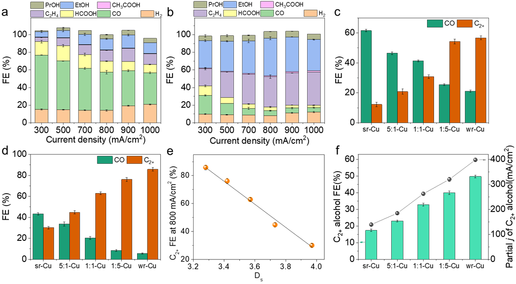 图2. sr-Cu (a)和 wr-Cu (b)在不同电流密度下二氧化碳产物分布, 在 (c) 300 mA/cm2和 (d) 800 mA/cm2 的电流密度下,不同催化剂上的 CO 和 C2+ 法拉第效率。(e)材料Ds值与在800 mA/cm2 的电流密度下C2+法拉第效率关系图。(f) 在 800 mA/cm2的电流密度下,C2+醇的法拉第效率和分电流密度。