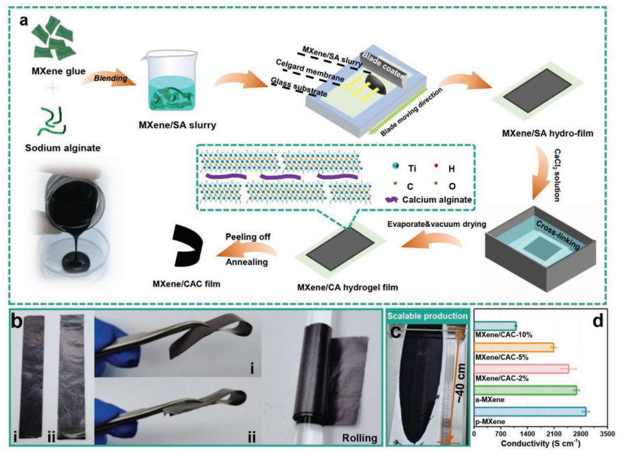 图1 a) MXene/CAC薄膜制备示意图。b,c) 显示i) MXene/CA-5%水凝胶和ii) MXene/CA-5%薄膜的形貌、柔韧性和可规模化制备的数码照片。d) p-MXene、a-MXene和MXene/CAC薄膜的电导率(n = 10)。© 2022 John Wiley & Sons, Inc.