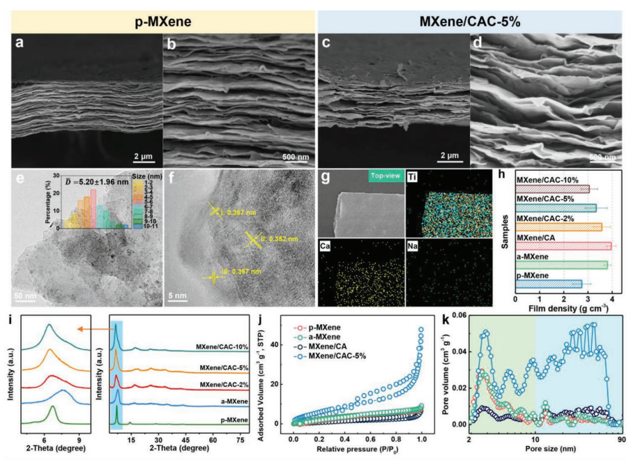 图2 a,b) p-MXene和c,d) MXene/CAC-5%薄膜的截面SEM图像。e) MXene/CAC-5%粉末的TEM和f) HRTEM图像,图2e的插图显示了碳点(n = 100)的粒径直方图。g) MXene/CAC-5%薄膜的SEM图像,对应的EDS映射显示Ti、Ca、Na元素的分布。p-MXene、a-MXene、MXene/CA和MXene/CAC-5%薄膜的h)膜密度(n = 8),i) XRD谱图,j) N2吸附-脱附等温线和(k)孔径分布图。© 2022 John Wiley & Sons, Inc.