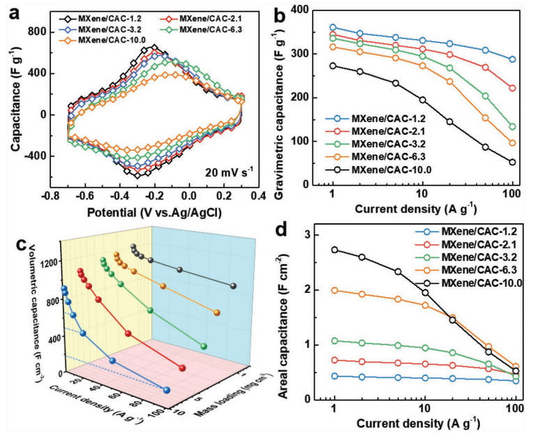 图4 MXene/CAC-5%在面载量为1.2 ~ 10.0 mg cm-2下的电化学性能。a) 20mV s-1时的CV曲线,电流密度从1到100 A g-1时的b)质量比电容,c)体积比电容和d)面积比电容。© 2022 John Wiley & Sons, Inc.