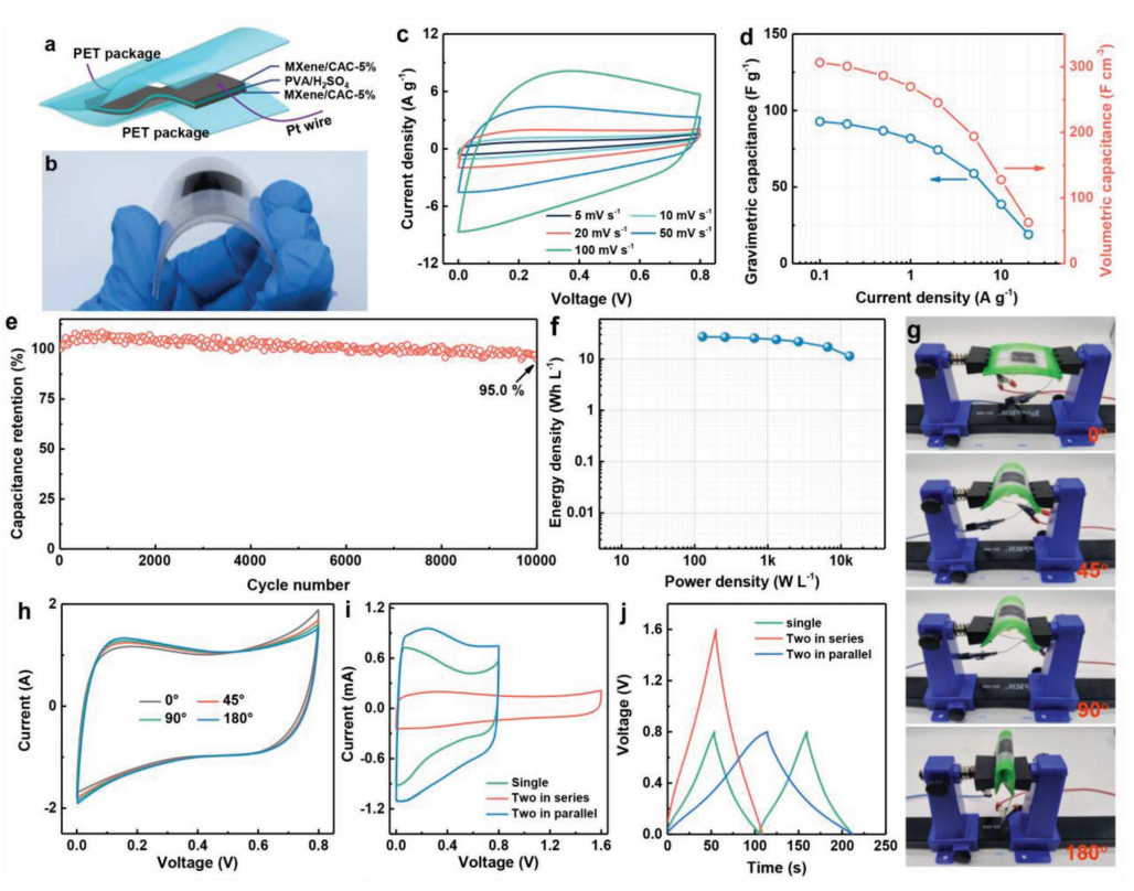 图5 基于MXene/CAC-5%膜的ASSC的结构和电化学性能。a) ASSC结构的示意图,b)相应的数码照片。c)不同电流密度下的CV曲线,d)倍率性能,e) 10 A g-1时的循环性能,f) MXene/CAC-5% ASSC的Ragone图。在0°、45°、90°和180°弯曲角度下的g)数码照片和h) CV曲线。两个MXene/ CAC-5% ASSC在串联和并联状态下的i) 20mV s-1时的CV曲线和j) GCD曲线。© 2022 John Wiley & Sons, Inc.