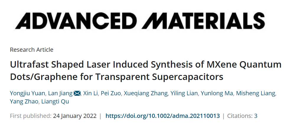 相关研究工作以“Ultrafast Shaped Laser Induced Synthesis of MXene Quantum Dots/Graphene for Transparent Supercapacitors”为题发表在国际顶级期刊Advanced Materials上。