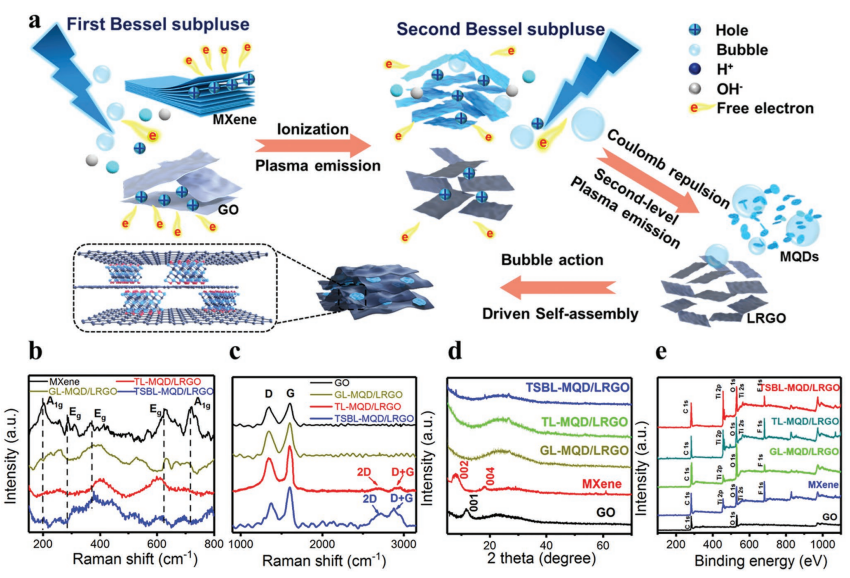 图3 三种不同类型激光加工MQD/LRGO复合材料的效果比较。a) TSBL处理过程。b,c) MXene、GO、GL-MQD/LRGO、TL-MQD/LRGO、TSBL-MQD/LRGO的拉曼光谱。d) MXene、GO、GL-MQD/LRGO、TL-MQD/LRGO、TSBL-MQD/LRGO的x射线衍射(XRD)图谱。e) MXene、GO、GL-MQD/LRGO、TL-MQD/LRGO、TSBL-MQD/LRGO的XPS测量谱。© 2022 John Wiley & Sons