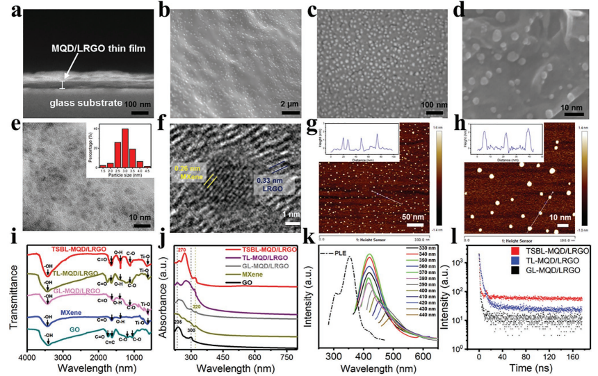 图4 用TSBL对MQD/LRGO进行了分析和光谱表征。a) MQD/LRGO的截面SEM图像。b,c) LRGO上附着MQD的表面的SEM图像。d)加载MQD后有褶皱的LRGO的FE-SEM图像。e) LRGO上TSBL-MQDs的透射电镜(TEM)图像。f) LRGO和MQD晶格的HRTEM图像。g,h) TSBL-MQDs结果的原子力显微镜(AFM)图像。i) MXene、GO、GL-MQD/LRGO、TL-MQD/LRGO、TSBL-MQD/LRGO的傅里叶变换红外(FTIR)光谱。j) MXene、GO、GL-MQD/LRGO、TL-MQD/LRGO、TSBL-MQD/LRGO的UV-vis吸收图谱。k) TSBL-MQDs的光致发光(PL)光谱(实线)和PL激发(PLE)(虚线)。l) TSBL-MQDs的生命期。© 2022 John Wiley & Sons