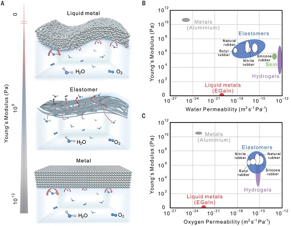 可拉伸电子器件的快速发展有望实现新型人机界面和柔型器件。传统的刚性电子器件封装在包装材料中,以保持活性物质(如氧气和水)远离敏感材料,从而确保器件的长期稳定性。可拉伸材料,如弹性体,具有大的自由体积和高的链移动性,比较容易渗透气体。然而,目前仍缺乏等效的可拉伸包裹材料为可拉伸器件和系统提供气密密封。