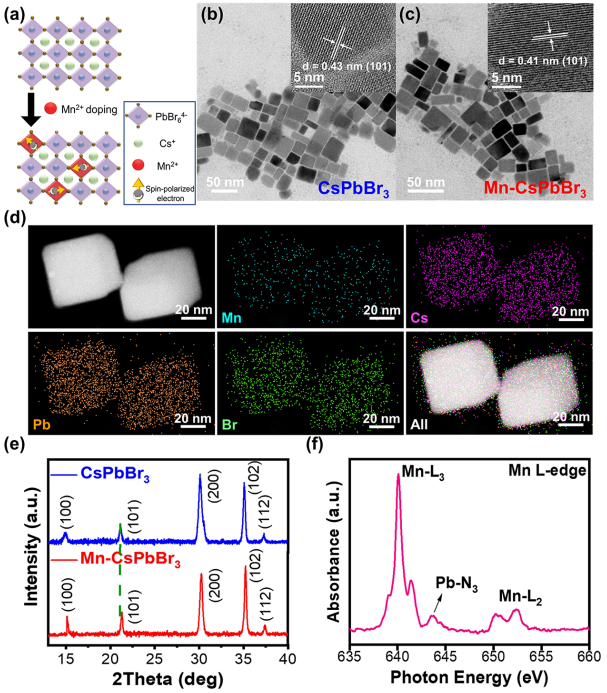该项工作中,以控制CsPbBr3中掺杂锰阳离子(Mn2+)并施加外部磁场来展开实验。结果表明与原始CsPbBr3 NPLs相比,Mn掺杂CsPbBr3 (Mn-CsPbBr3) NPLs由于掺杂后产生了自旋极化电子,实现了更出色的光催化CO2RR。并且外加磁场可以显著提高MnCsPbBr3 NPLs的光催化CO2RR。在300 mT的永磁体下,MnCsPbBr3 NPLs的光催化CO2RR性能提高了5.7倍。相关研究工作以“Spin-Polarized Photocatalytic CO2 Reduction of Mn-Doped