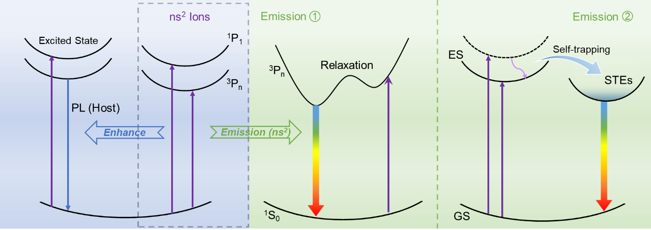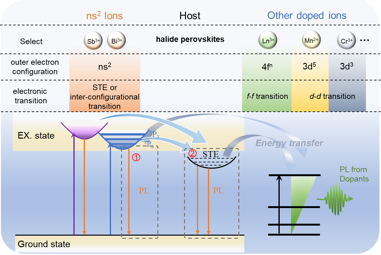图 4. 在金属卤化物钙钛矿中掺杂ns2离子可能的发光机理。