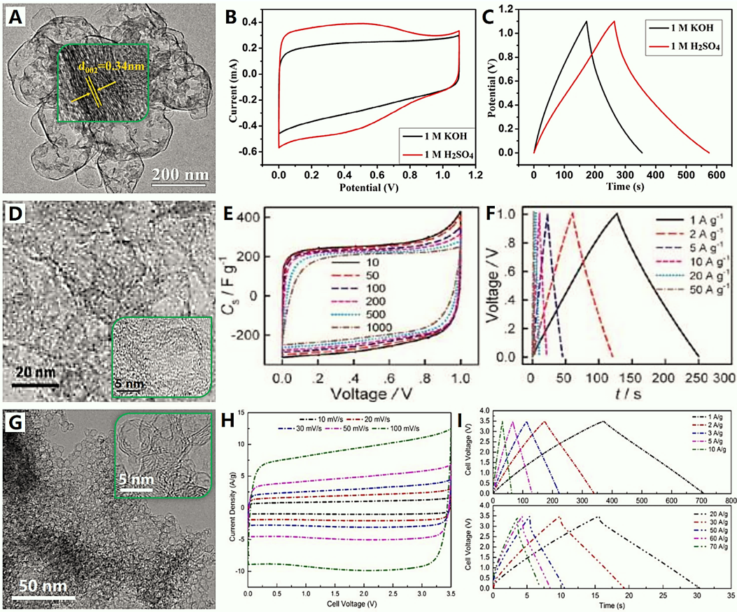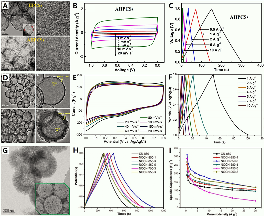 图2 用于高性能EDLCs的中空多孔(微/介孔)碳纳米球:(A-C)微孔和介孔空心碳纳米球; (D-F) N掺杂大介孔(~ 20 nm)空心碳纳米球; (G-I) N,O共掺杂折叠碳纳米笼(介孔空心碳纳米球)。