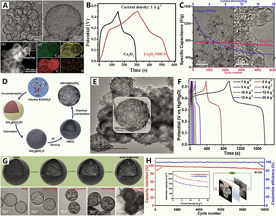 图3 高性能法拉第赝电容器空心碳纳米笼:(A-B)基于N掺杂碳空心球的Co3O4纳米片; (C)固定在碳纳米笼内的小Co3O4纳米颗粒; (D-F) Ni(OH)2纳米片上的空心碳纳米笼包裹结构; (G-H) Ni-Co-Mn氢氧化物纳米片@空心碳纳米笼“瓶中船”结构。